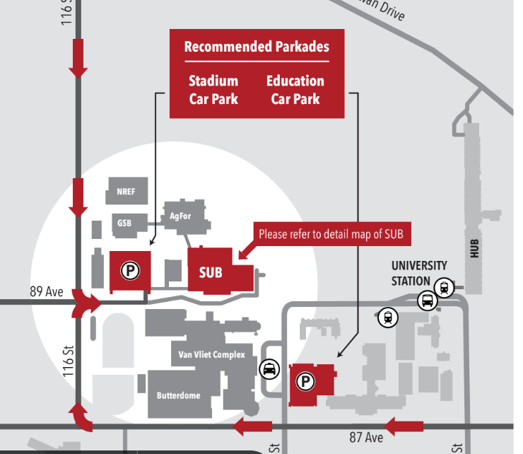 Public parking is available across campus. Closest parkade is the Stadium Carpark as it’s directly connected to the SUB via a pedway on level 7 of the parkade. Education Carpark is another great option as it’s only a few minutes walk to the venue.